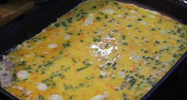 鸡蛋筹备好后,筹备好煎盘,最佳是方形的煎盘,若是没有也能够用圆形的煎盘,只是方形的做出来会更都雅,锅烧热后,把搅拌平均的鸡蛋倒进煎盘里,不克不及一下倒完了,一点一点的倒。